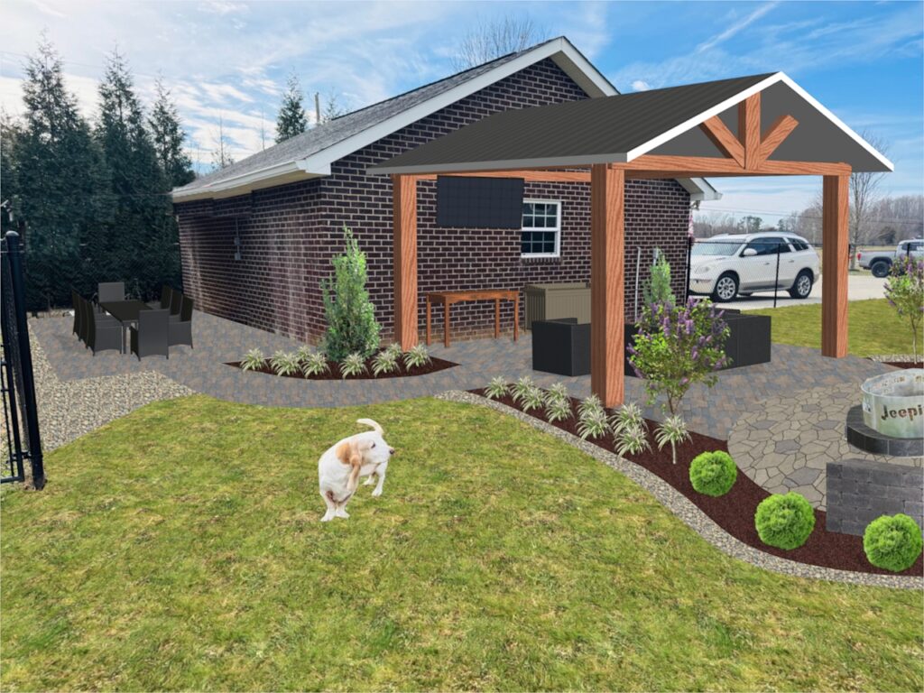 The final design showcases how professional landscape design and hardscaping can dramatically improve a backyard’s function and appearance. The covered structure creates a shaded gathering area, while the fire pit provides a natural focal point for entertaining. Layered plantings, clean edging, and quality materials give the space a polished, cohesive feel.